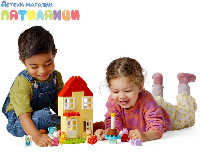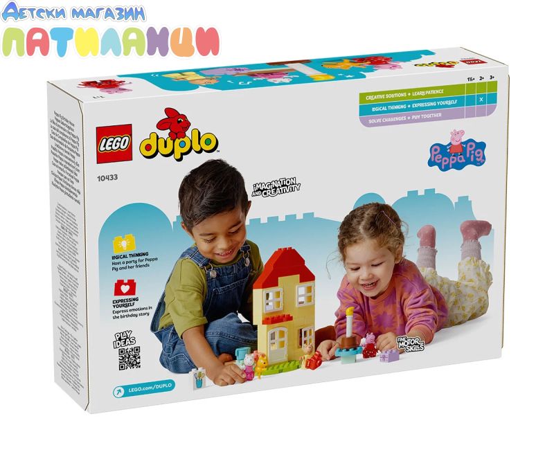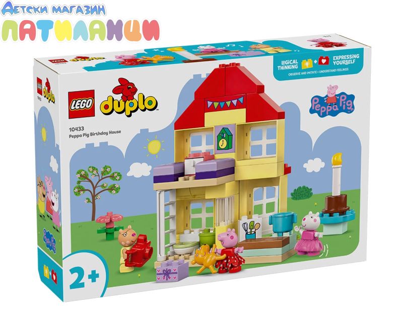 Зарадвайте феновете на Пепа с покана за парти! Децата в предучилищна възраст над 2 години се присъединяват към празника на Пепа и нейните приятели с комплекта Рожден ден на Пепа (10433). Тази играчка с Пепа идва с много функции, които децата ще разпознаят от ТВ сериала. В нея са включени фигури на Пепа, Педро и Сузи, както и на играчката на Пепа, Мечо. В емблематичната къща има баня, до която се стига стълба, и кухнята, в която децата и приготвят тортата за рожден ден. Има и баня с мивка, при която възрастните могат да обяснят колко е важно да си мием ръцете, особено преди да похапнем торта! Играчките за построяване и промяна на LEGO® DUPLO® с Пепа са проектирани за специално обучение на различни умения у деца в предучилищна възраст. Малките деца развиват логическо мислене, докато имитират реалния живот и разиграват сцени като посрещане на приятели, размяна на подаръци и разрязване на тортата. Освен това се учат да изразявате себе си, като представяте какво е да си част от такъв весел празник.