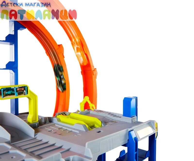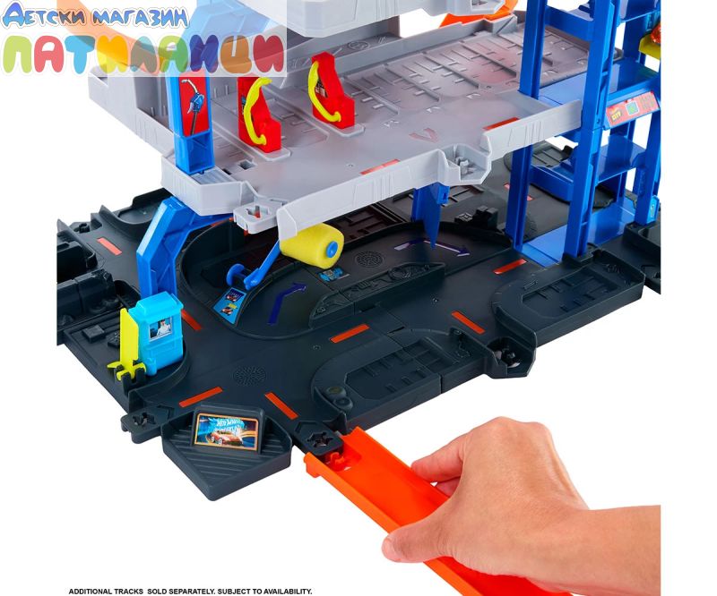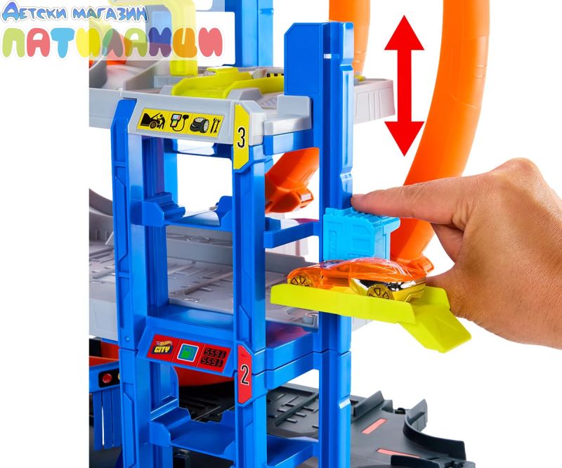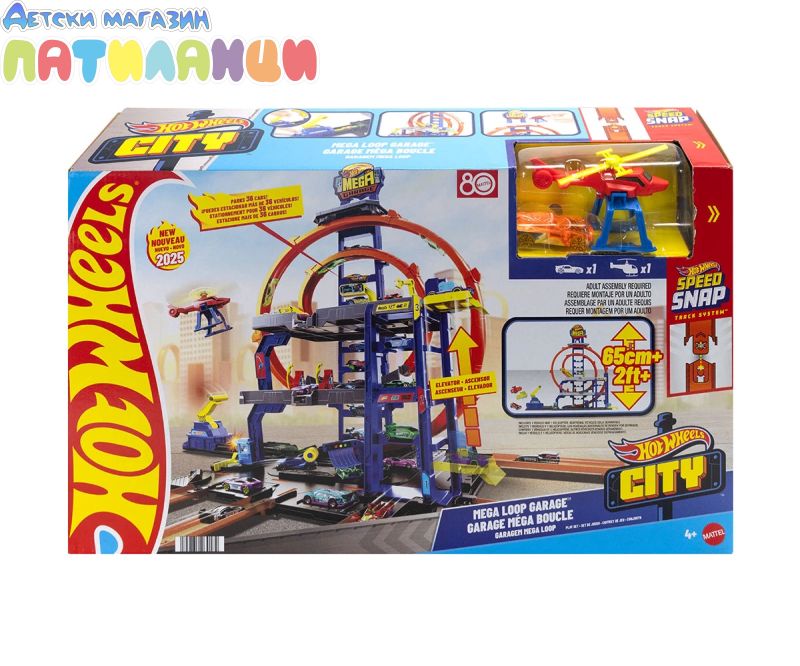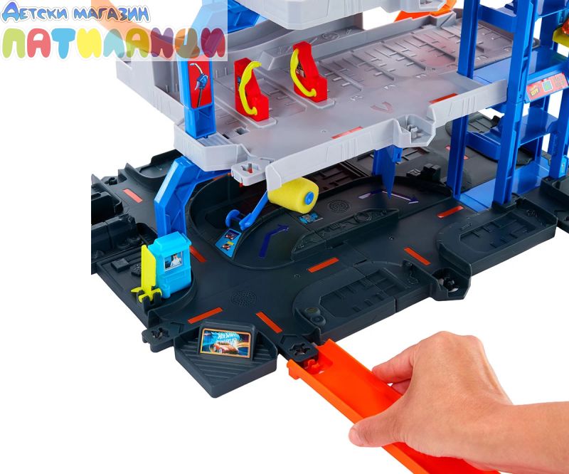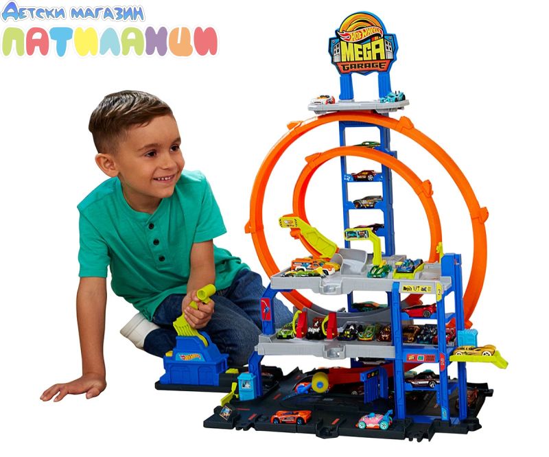 Игралният комплект Hot Wheels City – Мега гараж предлага три нива на екшън и забавление с коли, които вдъхновяват децата за вълнуващи истории и каскади! На приземния етаж на този многоетажен комплект децата могат да преминат през автомивка с въртящ се валяк от пяна и завеса за миене. След това заредете колата в изстрелвачката и я изпратете в двойната примка, където превключватели помагат да стигне до желания етаж. Използвайте асансьор с ръчно задвижване или хеликоптера за пренасяне на коли, за да транспортирате превозните средства до различните нива за паркиране. Можете да разширите играта с помощта на Speed Snap Track конектори.