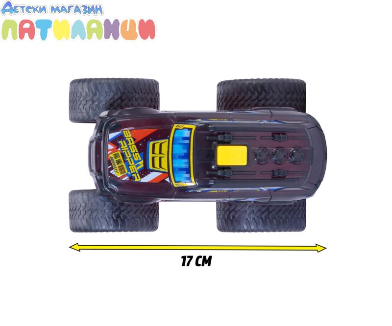 Незабележима? Не и с тази играчка кола! С мощното си тяло, огромните си гумени гуми и изобилието от мощност под капака, Bass Ripper привлича вниманието на всички. Но не само дизайнът прави впечатление - 17-сантиметровият монстър камион има какво да предложи и акустично: с натискането на един бутон започва фойерверк от звуци на двигател, ритъм и музика, придружени от променящи се LED светлини! Задвижвана от функцията за издърпване назад, навиващата се кола препуска из цялата стая - разнообразен подарък за деца над 3 години, който е готов за веднага, благодарение на включените батерии!
