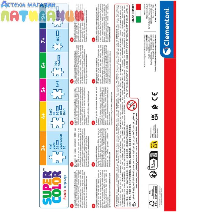 Остро осъзнавайки важността на екологичната осведоменост, Clementoni използва широко рециклирани материали и избягва всякакви компоненти, съдържащи замърсители. Произведено в Италия.