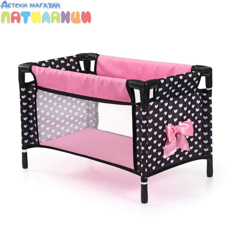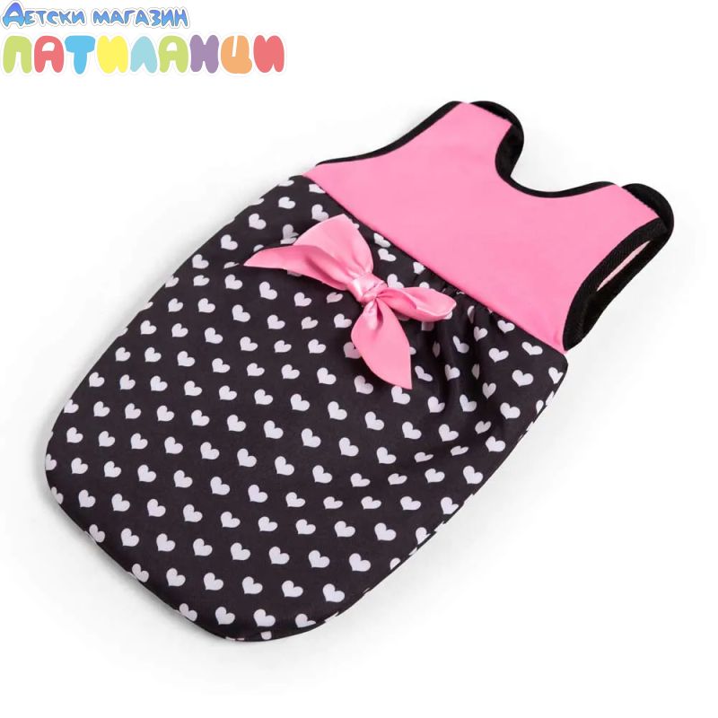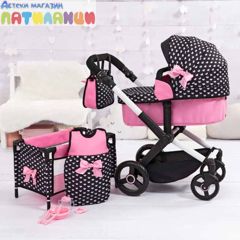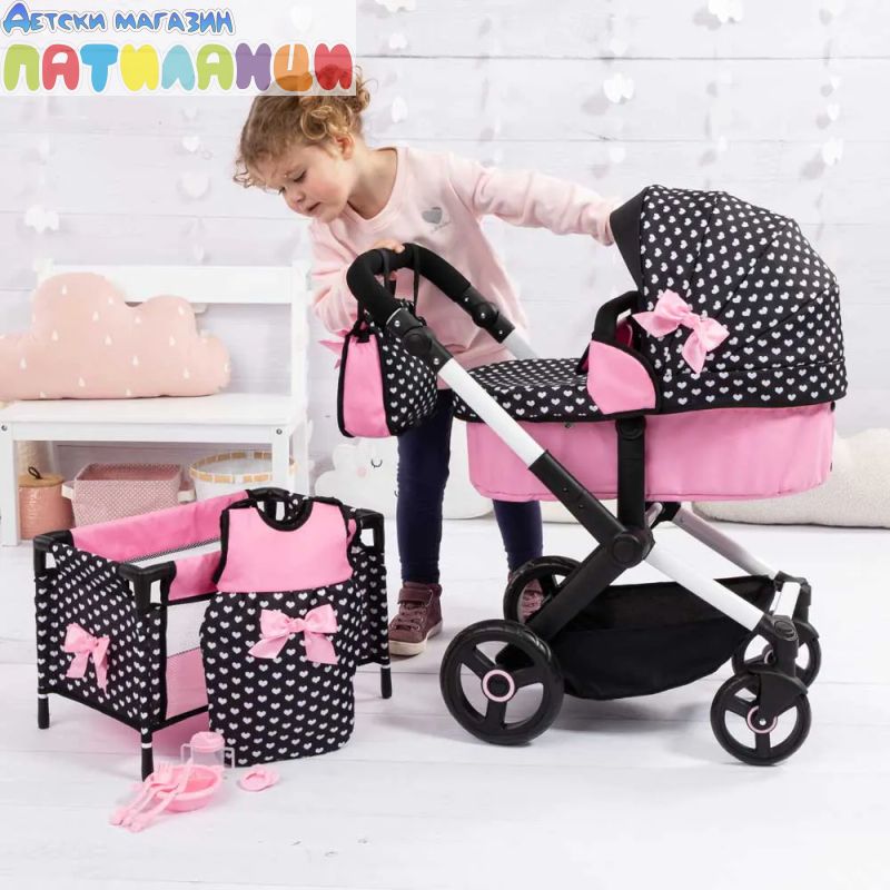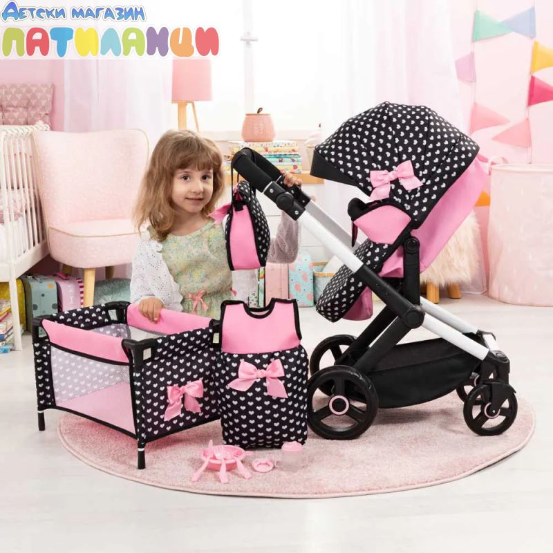 Комплектът включва: количка за кукли, легло за кукли, пластмасови прибори, чанта и спален чувал.