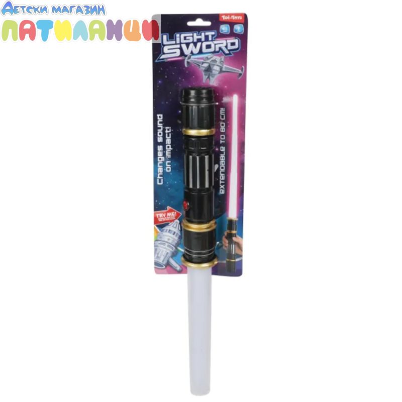 Меч за страховити битки и смели подвизи! Свети, издава звук при попадение и може да се удължи до 80 см!