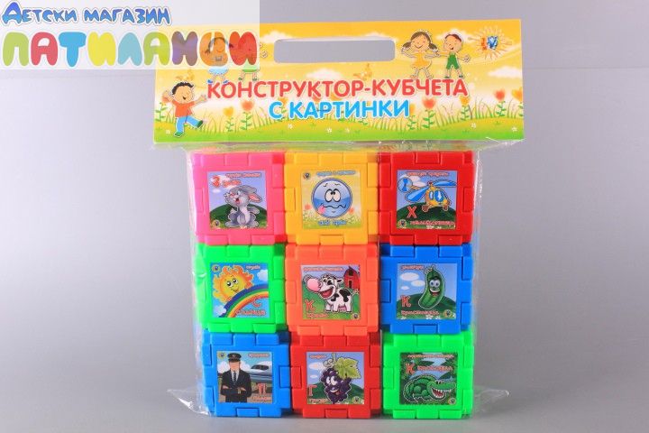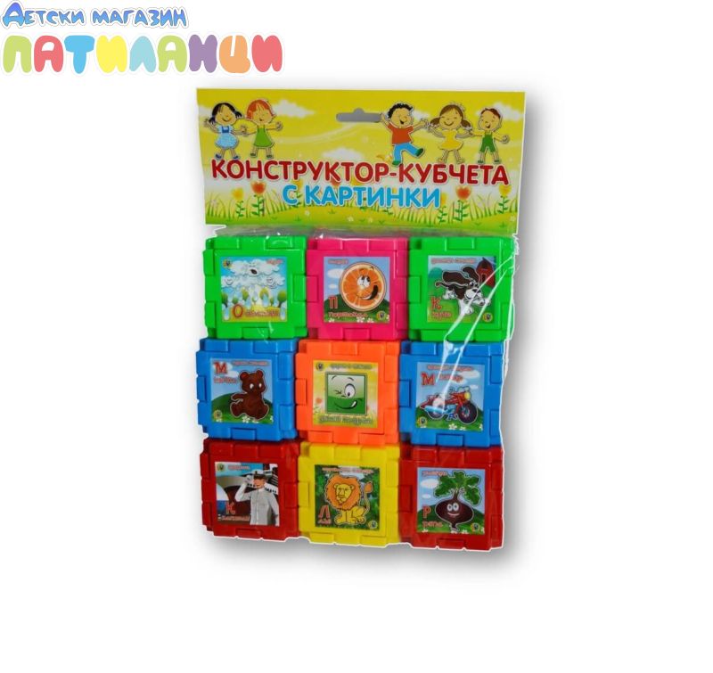 Пластмасова играчка.Комплектът съдържа елементи на конструктор с картинки с буквите от българската азбука и картинки на животни, растения, превозни средства, професии, сезони, форми и цветове, които започват със съответната буквичка.Размер на едно кубче-7*7*7 см.За деца над 3 години.