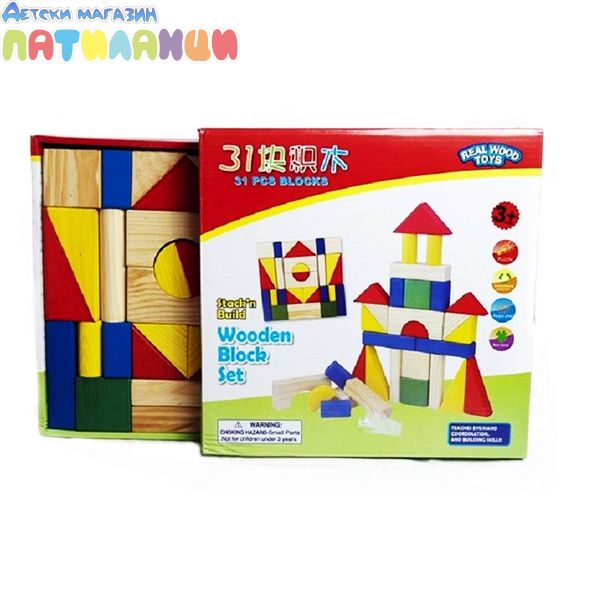 Building Blocks помага повишаване монтаж способността на вашето дете. С умерена трудност, то е добре проектирана и подходяща за развитието на интелигентността на детето си. Когато детето ви срещне затруднения, можете да го или я доведе до преодоляването им, което е чудесно за отглеждане на връзката родител-дете. Децата се учат на различни умения чрез игра с блокове, като моторни умения, изграждане и подреждане, съвпадение и да играе, координацията око-ръка. Пакетът включва 31 бр цветни дървени Building Blocks с различни форми.