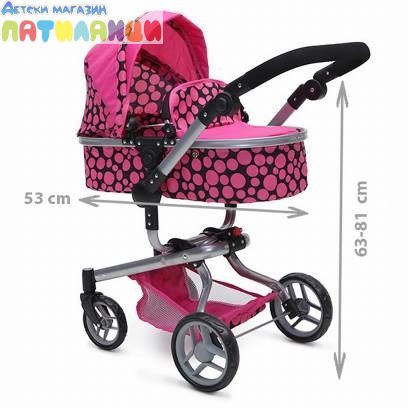 • Количката за кукли е със трансформиращ се кош, който може да се превърне в кош за новородено и в седалка, и чупеща се дръжка със 7 положения.