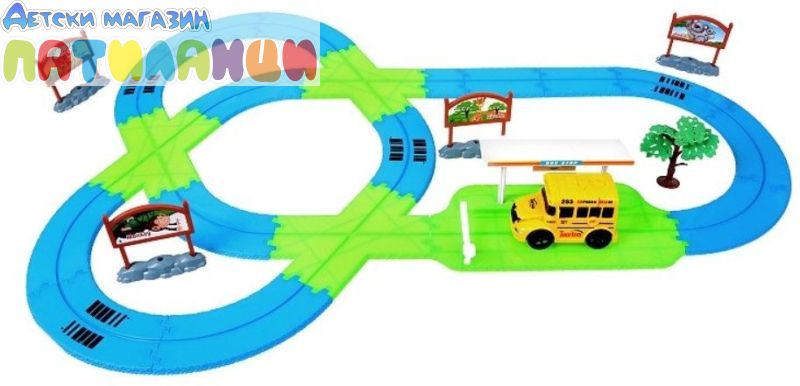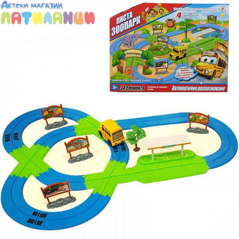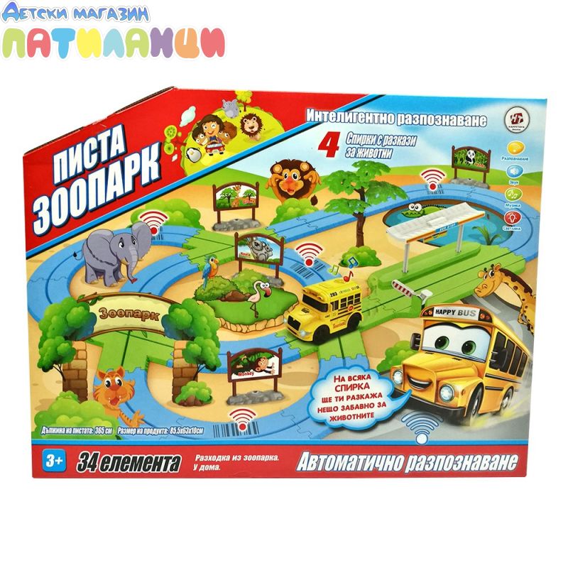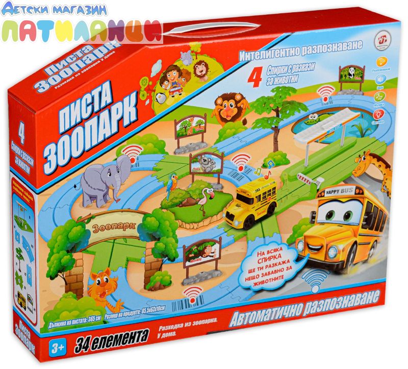 Обиколи зоопарка със специалния автобус на Happy Toys и чуй интересни разкази за животните с комплекта Писта с песни и разкази Зоопарк! Играта започва още с построяването на трасето. Кутията включва 34 елемента, сред които ще намерите спирки на различни животни, автобус, начална спирка за тръгване и спиране, декоративно дърво. Има и стикери, с които да декорирате и направите пистата още по-цветна.