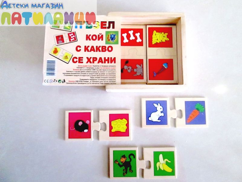 - Забавен дървен пъзел, който помага на децата да научат Кой с какво се храни!