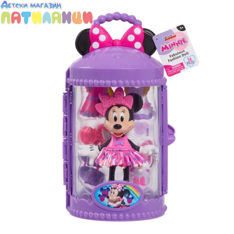 кукла Мини Маус, 2 чифта обувки, 3 рокли, чанта с еднорог, слънчеви очила, мобилен телефон, прозрачна кутия за съхранение с дръжка и др.