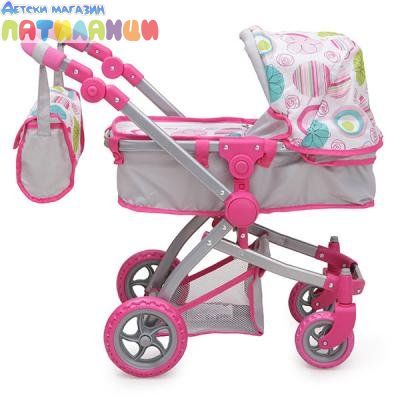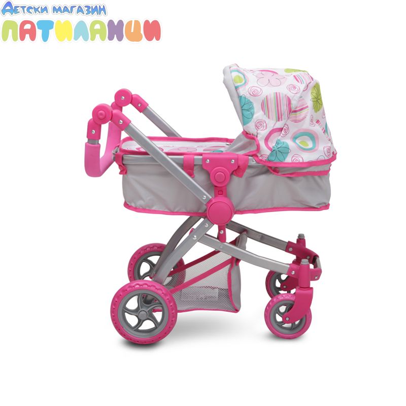 С тази детска играчка всяка малка принцеса ще се потопи във Вашя свят - светът на майката, грижеща се за своето дете. Ще създаде навици на ред, грижовност и отговорност в детето. А функционалността на детската играчка да се трансформира от количка с кош за новородено в количка за по-голямо дете ще задържи вниманието на момичето часове наред. Количката е снабдена и със сенник, които може да се регулира, както и с удобна чанта за прибирането на много продукти и аксесоари, необходими при разходката на едно бебе, а отдолу има и допълнителен кош. Дръжката на количката също може да се регулира.